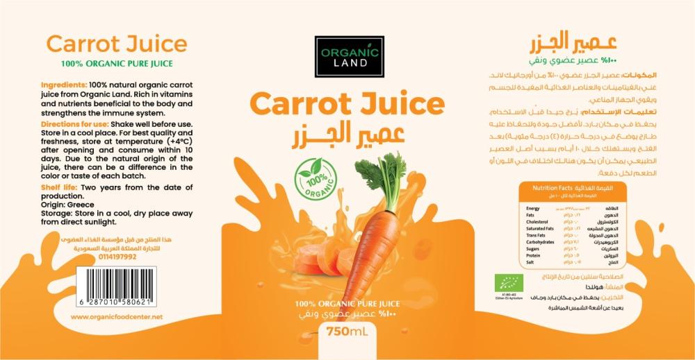 تمتع بنكهة طبيعية وقيمة غذائية عالية مع عصير الجزر العضوي من Organic Land، المحضر من جزر عضوي طازج 100% دون أي إضافات صناعية أو سكر مضاف.